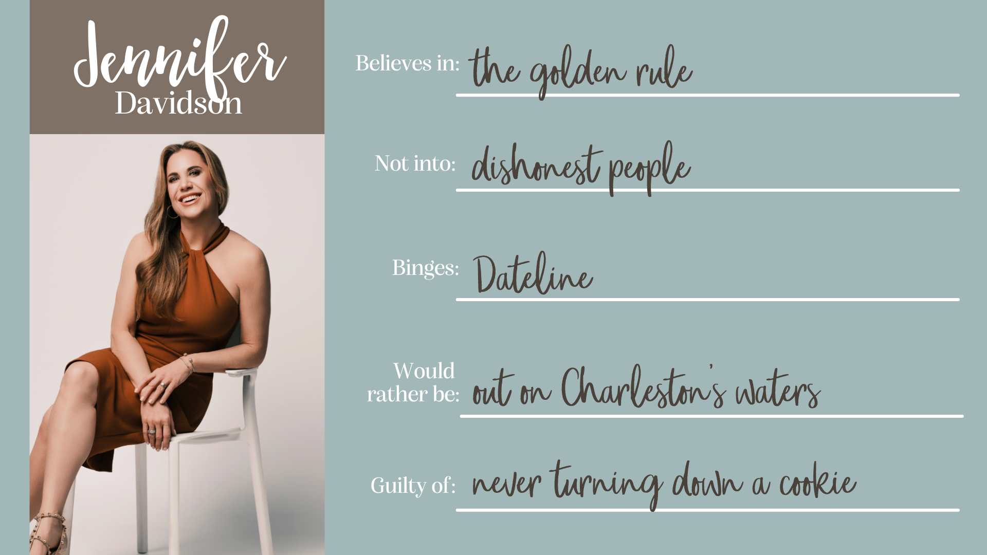 Jennifer is a second-generation Realtor and ninth-generation Carolinian who spent nearly three decades in corporate media sales before transitioning to real estate full time, following years of successful renovation investments and a lifetime of learning under her real-estate parents. Known for her ability to recognize the hidden potential in homes others may overlook, she brings a distinct advantage to clients navigating Charleston’s competitive market. Jennifer and her husband, Patrick, raised two thriving adult children in the Mount Pleasant area and are now reluctant empty-nesters. They remain active in their local church and civic events and enjoy spending time exploring Charleston’s evolving restaurant scene and deep connection to American history.